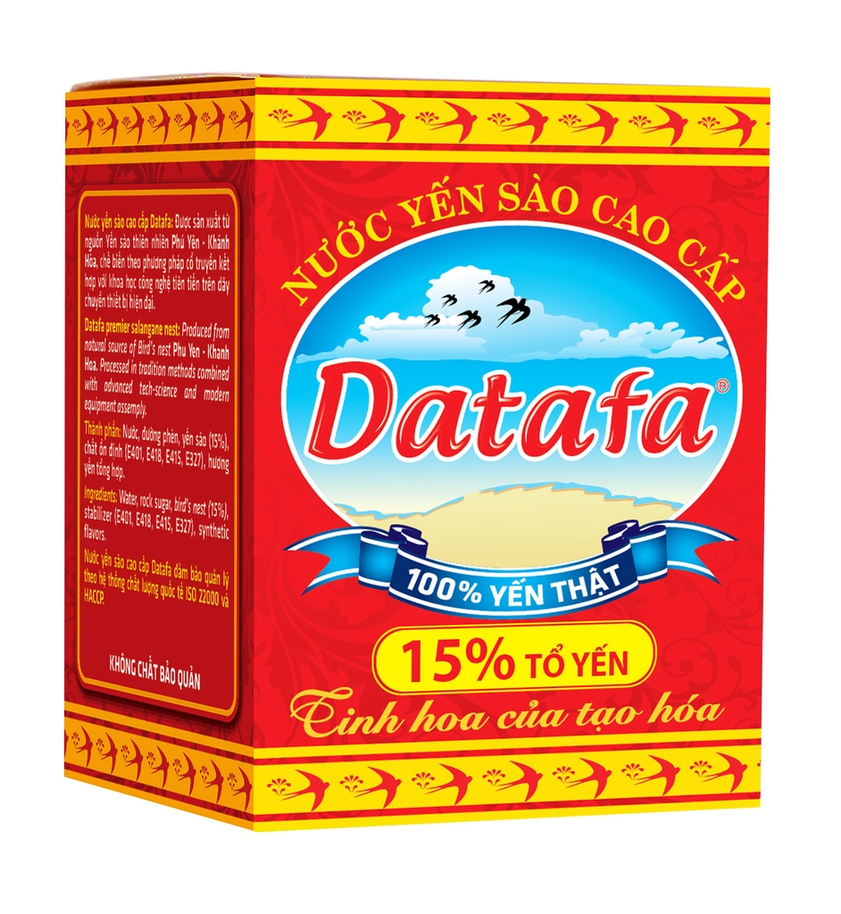 Yến sào cao cấp DATAFA® là sản phẩm chiếm tới 15% tổ yến, nước và đường phèn, được sản xuất từ nguồn yến sào thiên nhiên tại Phú Yến – Khánh Hoà theo phương pháp cổ truyền kết hợp với khoa học công nghệ tiên tiến trên dây chuyền thiết bị hiện đại.